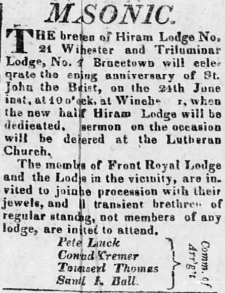 On page 4 of the Winchester Gazette on June 22, 1822, Hiram Lodge No. 21 and Triluminar Lodge No. 117 invited Front Royal Lodge No. 102 to celebrate St. John the Baptist on June 24, 1822 where the new hall of the Hiram Lodge would be dedicated.