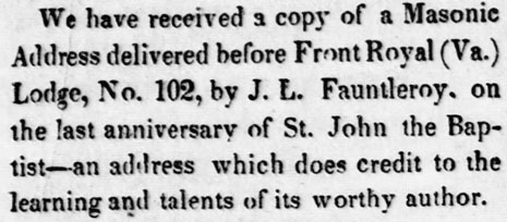 On July 21, 1842 the Alexandria Gazette advertised that they had a copy of a Masonic Address that was delivered by J. L. Fauntleroy on St. John the Baptist anniversary (June 24th) to Front Royal Lodge No. 102.