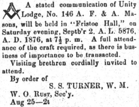 A stated communication of Unity Lodge, No. 146 A. F. & A. M. Masons, will be held in “Fristoe Hall,” on Saturday evening, Septb’r 2, A. L. 5876, A. D. 1876, at 7½ p. m. A full attendance of the craft required, as there is business of importance to be transacted.