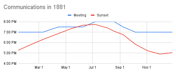 The Lodge gathered for communications in Union Hall on the Thursday of, or prior to the full moon. This would help light the way at night when the brethren returned home. Meeting times changed to ensure more work outside of the lodge could be done in the fields during long summer days, and allow meetings to begin after sunset.