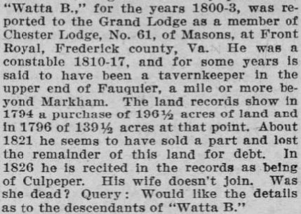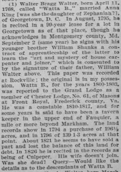 In the October 8th and 15th, 1905 The Baltimore Sun, correspondence via Virginia Heraldry letter box from W. M. W. called for help finding out about the families of Walter, Shanks, Gardiner, Love and Rovell. In their request, we find information about Walter “Watta B.” Bragg Walter who was a member of Chester Lodge No. 61 from 1800 to 1803 in Front Royal, Frederick County, Va. They were provided the membership details by the Grand Lodge of Virginia.