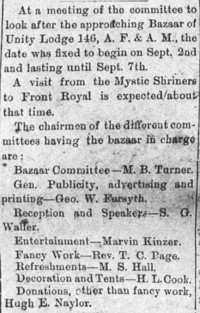 At a meeting of the committee to look after the approaching Bazaar of Unity Lodge 146, A. F. & A. M., the date was fixed to begin on Sept. 2nd and lasting until Sept. 7th.