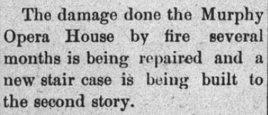 The damage done to the Murphy Opera House by fire several months is being repaired and a new stair case is being built to the second story.