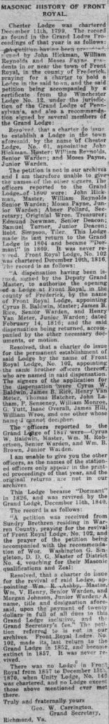 “A petition was received from Sundry Brethren residing in Warren County, praying for the revival of Front Royal Lodge, No. 102, and the prayer of the petition being accompanied with the recommendation of Wor. Washington G. Singleton, D. D. G. Master of District No. 4, vouching for their Masonic qualifications and Zeal:
