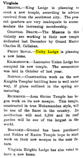 In the Scottish Rite News Bureau, we find Unity Lodge in Front Royal on the second page is planning a new home.