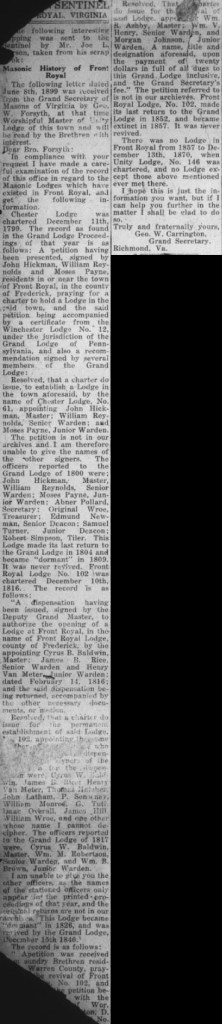 Resolved That …harter do issue for the …val of said Lodge appo….g Wm. R. Ashby, Master; Wm. V. Henry, Senior Warden, and Morgan Johnson, Junior Warden. A name, title and designation aforesaid, upon the payment of twenty dollars in full of all dues to this Grand Lodge inclusive, and the Grand Secretary’s fee.” The petition referred to is not in our archives. Front Royal Lodge, No. 102, made its last return to the Grand Lodge in 1852, and became extinct in 1857. It was never revived.