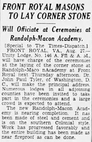 On August 28, 1927, The Richmond Times-Dispatch reported that the Front Royal Unity Lodge No. 146 was to officiate the laying of the corner stone ceremony at Randolph-Macon Academy on September 1st with the expectation that there would be a large crowd, as well as many lodges attending. The Academy was close to completion and was made to be fireproof.