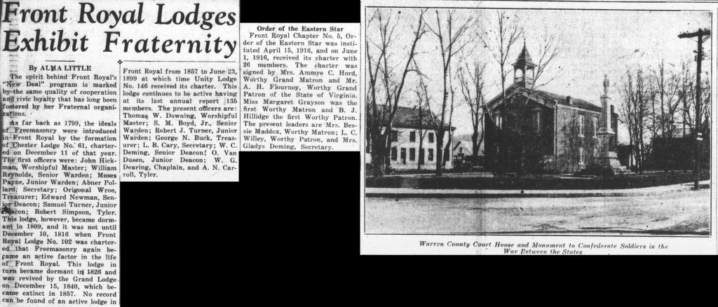As far back as 1799, the ideals of Freemasonry were introduced in Front Royal by the formation of Chester Lodge No. 61, chartered on December 11 of that year. The first officers were: John Hickman, Worshipful Master; William Reynolds, Senior Warden; Moses ; Payne, Junior Warden; Abner Pollard; Secretary; Origonal Wroe, Treasurer; Edward Newman, Senior Deacon; Samuel Turner, Junior Deacon; Robert Simpson, Tyler. This lodge, however, became dormant in 1809, and it was not until December 10, 1816 when Front Royal Lodge No. 102 was chartered, that Freemasonry again became an active factor in the life of Front Royal. This lodge in turn became dormant in 1826 and was revived by the Grand Lodge on December 15, 1840, which became extinct in 1857. No record can be found of an active lodge in Front Royal from 1857 to June 23, 1899 at which time Unity Lodge No. 146 received its charter. This lodge continues to be active having at its last annual report 135 members. The present officers are: Thomas W. Downing, Worshipful Master; S. M. Boyd, Jr., Senior Warden; Robert J. Turner, Junior Warden; George N. Buck, Treasurer; L. B. Cary, Secretary; W. C. Deming, Senior Deacon; O. Van Dusen, Junior Deacon; W. G. Dearing, Chaplain, and A. N. Carroll, Tyler.