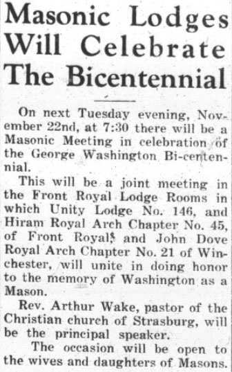 This will be a joint meeting in the Front Royal Lodge Rooms in which Unity Lodge No. 146, and Hiram Royal Arch Chapter No. 45, of Front Royal, and John Dove Royal Arch Chapter No. 21 of Winchester, will unite in doing honor to the memory of Washington as a Mason.