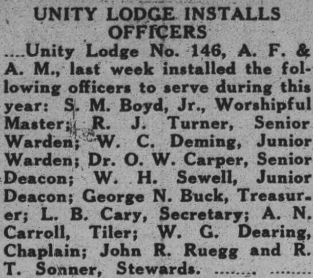Unity Lodge No. 146, A. F. & A. M., last week installed the following officers to serve during this year: S. M. Boyd, Jr., Worshipful Master; R. J. Turner, Senior Warden; W. C. Deming, Junior Warden; Dr. O. W. Carper, Senior Deacon; W. H. Sewell, Junior Deacon; George N. Buck, Treasurer; L. B. Cary, Secretary; A. N. Carroll, Tiler; W. G. Dearing, Chaplain; John R. Ruegg and R. T. Sonner, Stewards.