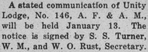 A stated communication of Unity Lodge, No. 146, A. F. & A. M., will be held January 13. The notice is signed by S. S. Turner, W. M., and W. O. Rust, Secretary.