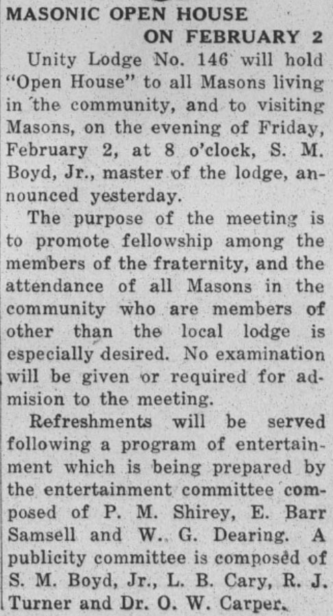 Unity Lodge No. 146 will hold “Open House” to all Masons living in the community, and to visiting Masons, on the evening of Friday, February 2, at 8 o’clock, S. M. Boyd, Jr., master of the lodge, announced yesterday.