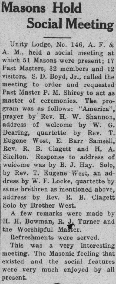 Unity Lodge, No. 146, A. F. & A. M., held a social meeting at which 51 Masons were present; 17 Past Masters, 32 members and 12 visitors. S. D. Boyd, Jr., called the meeting to order and requested Past Master P. M. Shirey to act as master of ceremonies. The program was as follows: “America”, prayer by Rev. H. W. Shannon, address of welcome by W. G. Dearing, quartette by Rev. T. Eugene West, E. Barr Samsell, Rev. R. B. Clagett and H. A. Skelton. Response to address of welcome was by B. J. Hay. Solo, by Rev. T. Eugene West, an address by W. F. Locke, quartette by same brethren as mentioned above, address by Rev. R. B. Clagett Solo by Brother West.