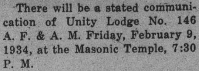 There will be a stated communication of Unity Lodge No. 146 A. F. & A. M. Friday, February 9, 1934, at the Masonic Temple, 7:30 P. M.
