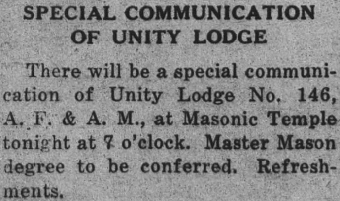 There will be a special communication of Unity Lodge No. 146, A. F. & A. M., at Masonic Temple tonight at 7 o’clock. Master Mason degree to be conferred. Refreshments.