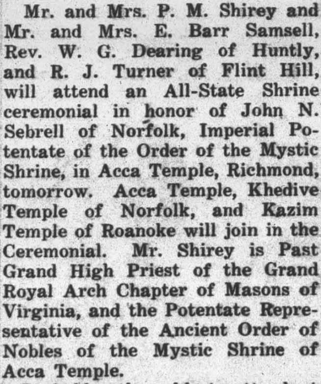 Mr. and Mrs. P. M. Shirey and Mr. and Mrs. E. Barr Samsell, Rev. W. G. Dearing of Huntly, and R. J. Turner of Flint Hill, will attend an All-State Shrine ceremonial in honor of John N. Sebrell of Norfolk, Imperial Potentate of the Order of the Mystic Shrine, in Acca Temple, Richmond, tomorrow. Acca Temple, Khedive Temple of Norfolk, and Kazim Temple of Roanoke will join in the Ceremonial. Mr. Shirey is Past Grand High Priest of the Grand Royal Arch Chapter of Masons of Virginia, and the Potentate Representative of the Ancient Order of Nobles of the Mystic Shrine of Acca Temple.
