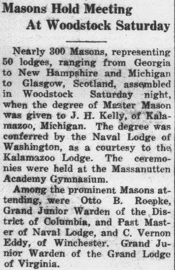 Nearly 300 Masons, representing 50 lodges, ranging from Georgia to New Hampshire and Michigan to Glasgow, Scotland, assembled in Woodstock Saturday night, when the degree of Master Mason was given to J. H. Kelly, of Kalamazoo, Michigan. The degree was conferred by the Naval Lodge of Washington, as a courtesy to the Kalamazoo Lodge. The ceremonies were held at the Massanutten Academy Gymnasium.