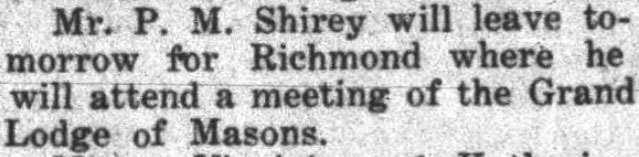 Mr. P. M. Shirey will leave tomorrow for Richmond where he will attend a meeting of the Grand Lodge of Masons.