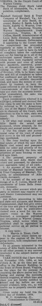 On October 25, 1934 the Warren Sentinel had a notice published by the Commissioner in Chancery, W. C. Armstrong, Jr., which described their office as being in the Masonic Building in the Town of Front Royal, Virginia on October 22, 1934.