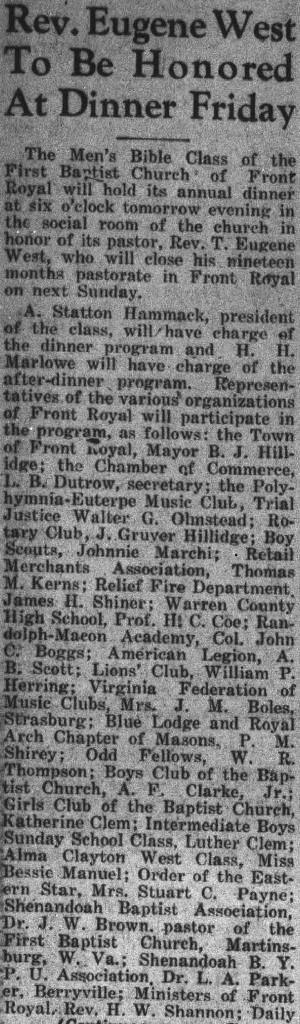 The Men’s Bible Class of the First Baptist Church of Front Royal will hold its annual dinner at six o’clock tomorrow evening in the social room of the church in honor of its pastor, Rev. T. Eugene West, who will close his nineteen months pastorate in Front Royal on next Sunday.