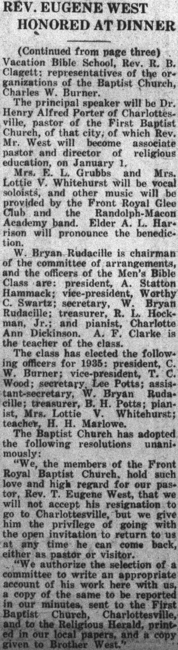“We, the members of the Front Royal Baptist Church, hold such love and high regard for our pastor, Rev. T. Eugene West, that we will not accept his resignation to go to Charlottesville, but we give him the privilege of going with the open invitation to return to us at any time he can come back, either as pastor or visitor.