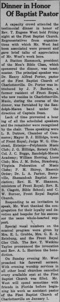 On Sunday evening Mr. West preached his farewell sermon. With evening worship services in all other local churches cancelled every available seat at the First Baptist Church was filled. Mr. West will spend sometime with friends in Florida before beginning his work as assistant pastor of the First Baptist Church of Charlottesville on January 1.