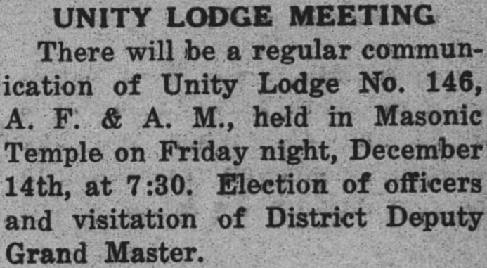 There will be a regular communication of Unity Lodge No. 146, A. F. & A. M., held in Masonic Temple on Friday night, December 14th, at 7:30. Election of officers and visitation of District Deputy Grand Master.