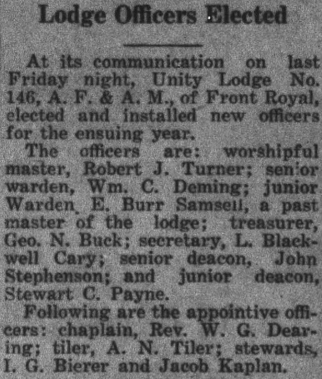 At its communication on last Friday night, Unity Lodge No. 146, A. F. & A. M., of Front Royal, elected and installed new officers for the ensuing year.