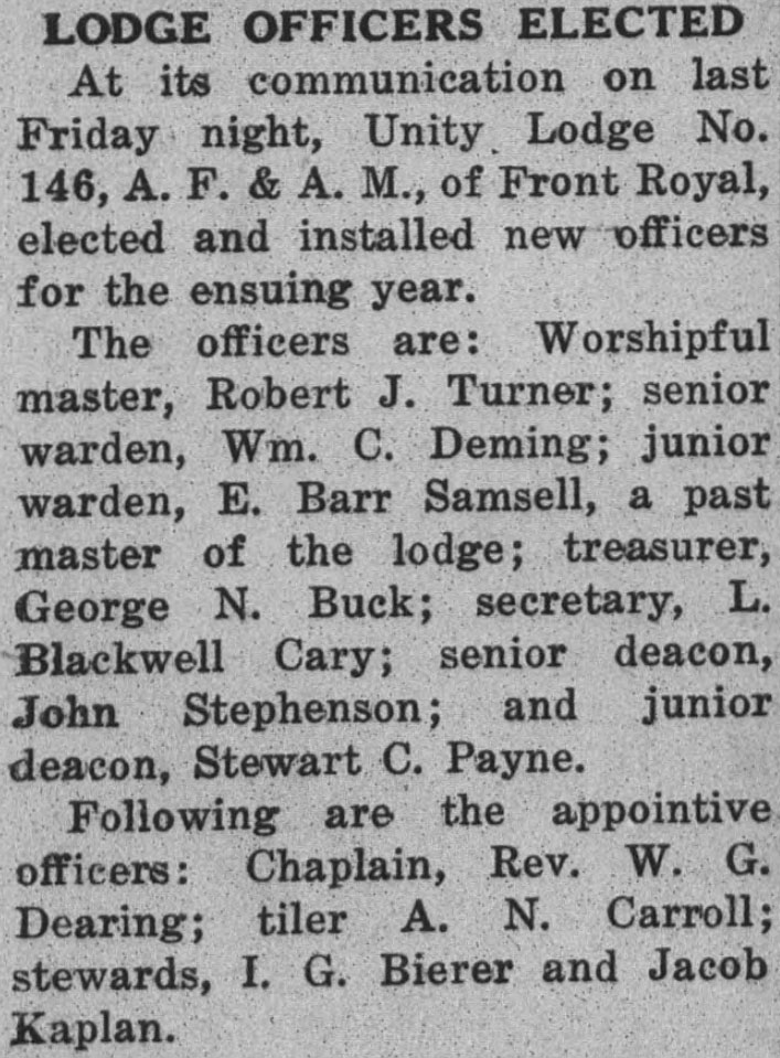 At its communication on last Friday night, Unity Lodge No. 146, A. F. & A. M., of Front Royal, elected and installed new officers for the ensuing year.