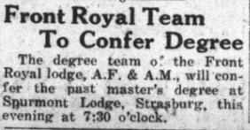 The degree team of the Front Royal lodge, A.F. & A.M., will confer the past master’s degree at Spurmont Lodge, Strasburg, this evening at 7:30 o’clock.