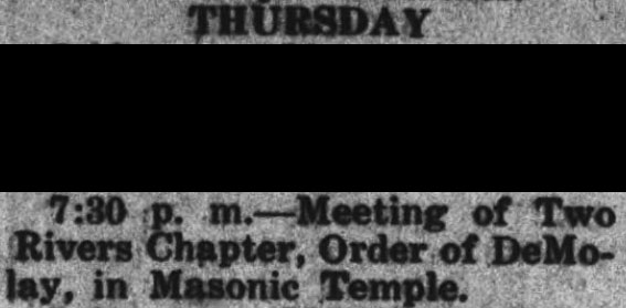 The Two Rivers Chapter of the Order of DeMolay had a meeting on February 24, 1944 at the Masonic Temple at 7:30pm.
