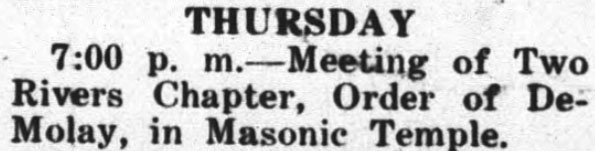 The Two Rivers Chapter of the Order of DeMolay had a meeting on June 22, 1944 at the Masonic Temple at 7:00pm.