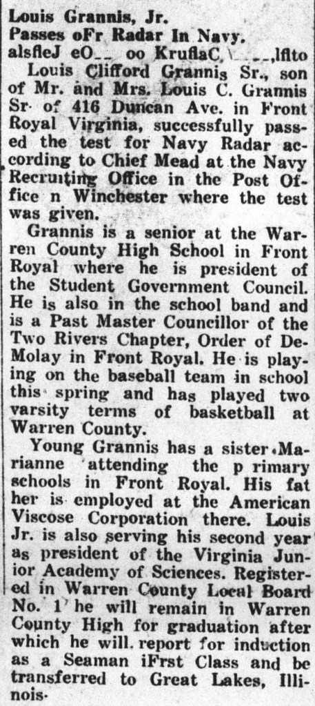 Louis Clifford Grannis Sr., son of Mr. and Mrs. Louis C. Grannis Sr of 416 Duncan Ave. in Front Royal Virginia, successfully passed the test for Navy Radar according to Chief Mead at the Navy Recruiting Office in the Post Office in Winchester where the test was given.