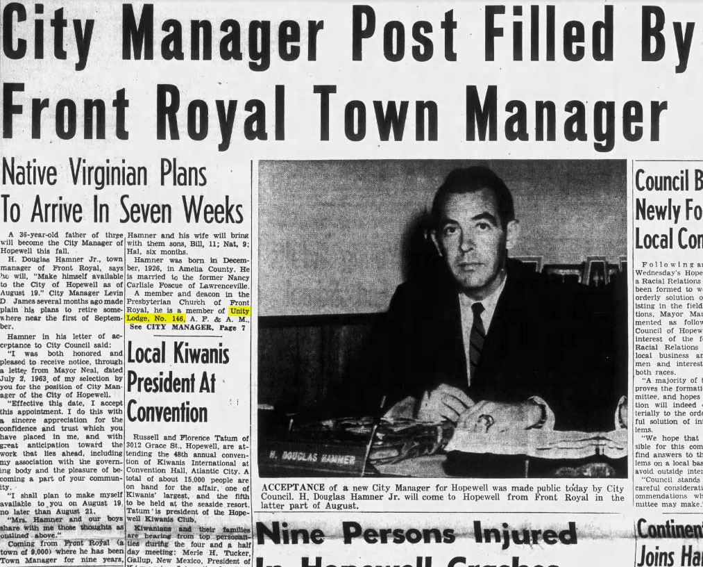 In The Hopewell News issued on July 5, 1963, we see one of our members, H. Douglas Hammer Jr, was the Town Manager of Front Royal for nine years, and moved on to become a City Manager in Hopewell. Not only was he a member of Unity Lodge No. 146, but he was also Hiram Royal Arch Chapter No. 45.