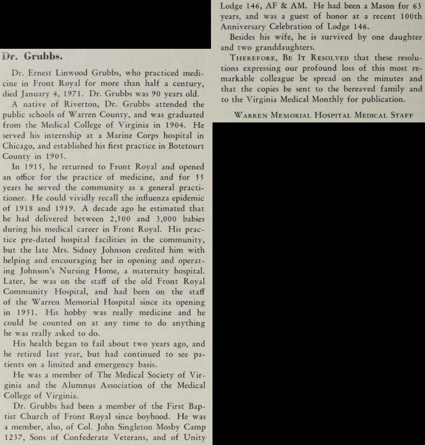 Dr. Ernest Linwood Grubbs, who practiced medicine in Front Royal for more than half a century, died January 4, 1971. Dr. Grubbs was 90 years old.