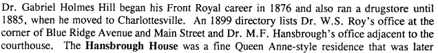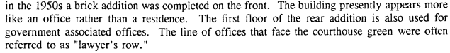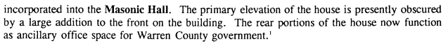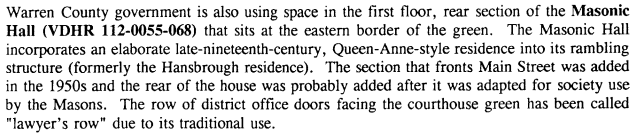 On pages 70, 74 and 75, we find that the Masonic Hall was previously called “the Hansbrough residence” which was a Queen-Anne style residence. It has had sections added to the front and back of the house. The rear of the Masonic Hall was being used by the Warren County government as ancillary office space. The office doors facing the courthouse green were nicknamed “layer’s row”.