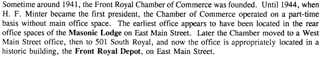 On page 122, we find that the Front Royal Chamber of Commerce was founded in 1941, and in 1941 they operated in the office space appeared in the rear of the Masonic Lodge before moving to a West Main Street Office.