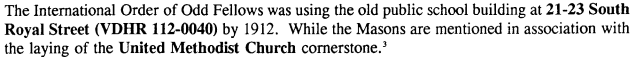 Also on Page 98, we see mention of the location for the International Order of Oddfellows in the old public school building. Although not mentioned here – it is of note that the Masons, Order of Odd Fellows, and two other secret societies had agreed on October 7, 1876 (Acts of 1886-7 Ch. 126) to construct the third floor of the school building and lease it from the school district jointly. From this information, we can deduce that prior to building the Masonic Hall, Unity Lodge No. 146 was previously holding meetings at 21-23 South Royal Avenue on the third floor.