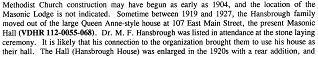 On page 98, we find another reference to the Masonic Hall being located at 107 East Main Street built in the 1890s and 1950s due to additions/remodeling.