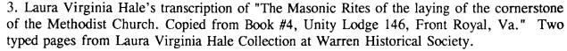 On Page 100 Endnotes, we see that Unity Lodge No. 146 had recorded the cornerstone laying at the Methodist Church in “Book #4”, and that the Warren Historical Society has a two page typing of the Masonic Rites in the Laura Virginia Hale Collection.
