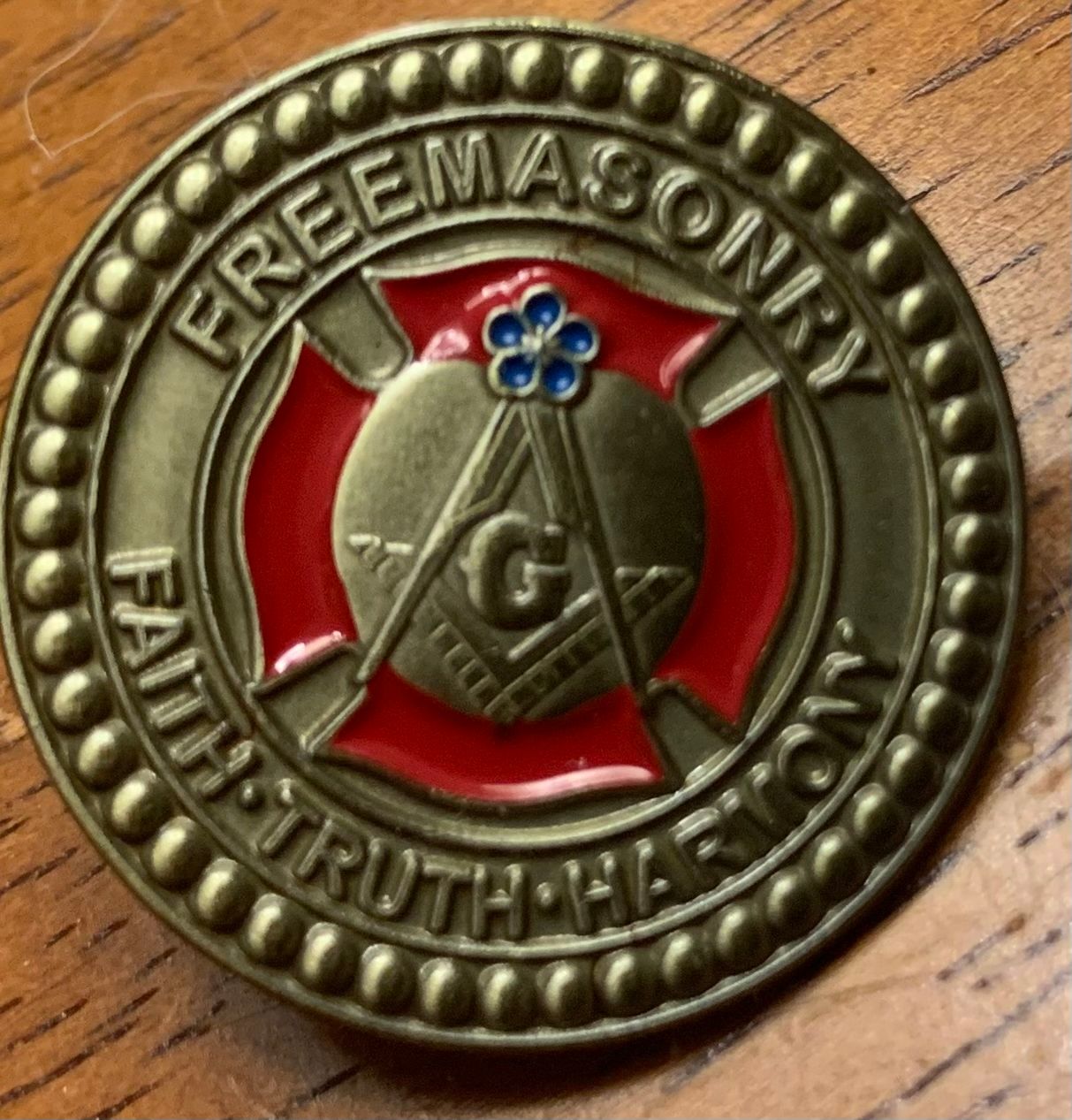 MW Huffman’s brass pin is especially notable, featuring the square and compasses over the Maltese cross known as a symbol of the fire service, along with a “Forget-Me-Not” flower and the phrase “Faith, Truth, Harmony”.